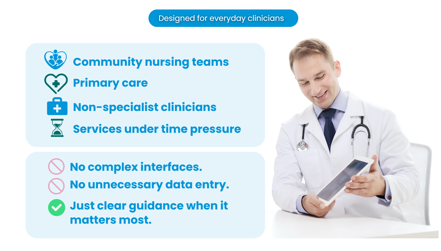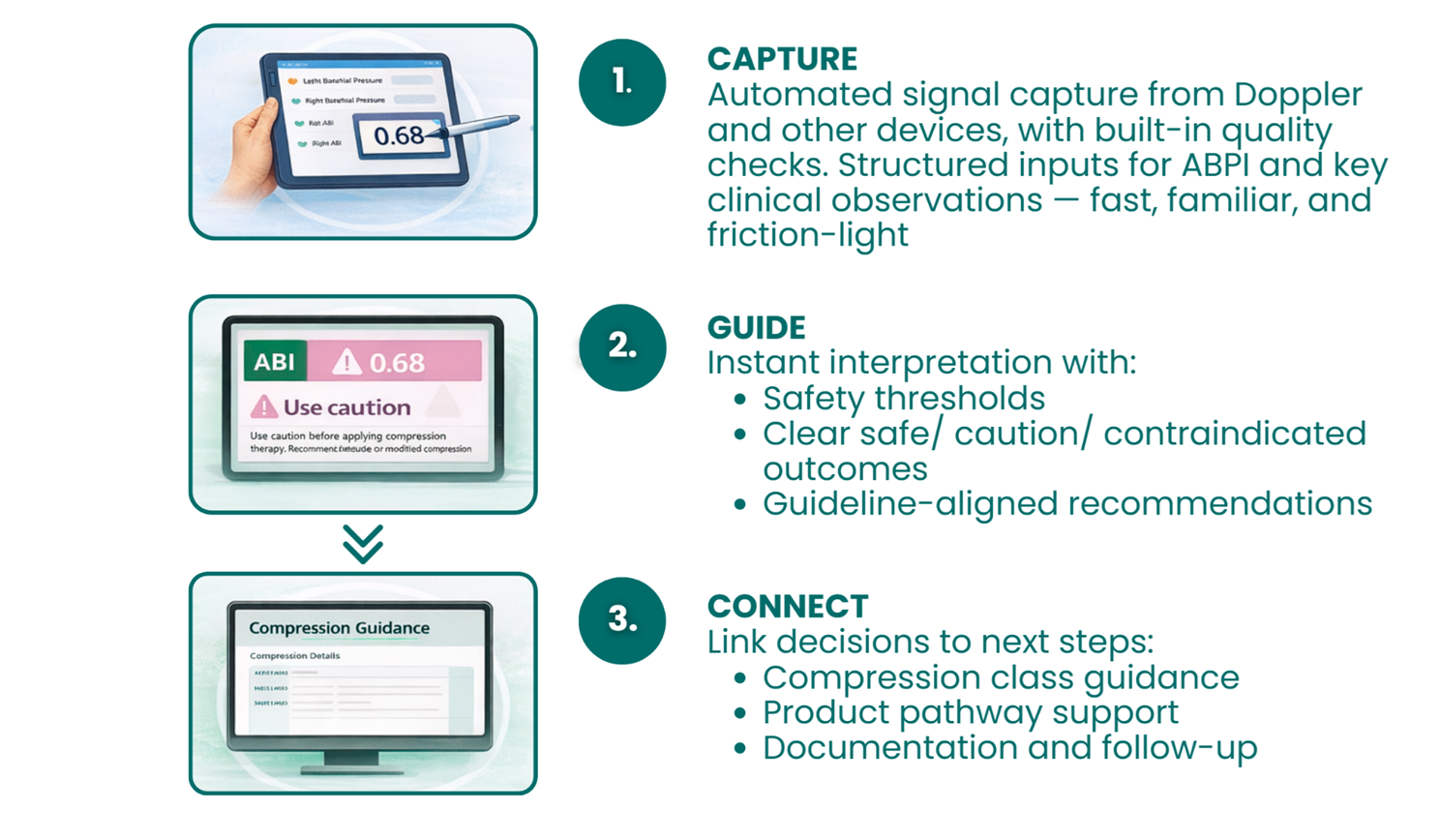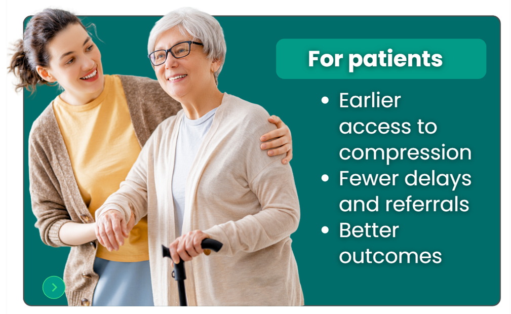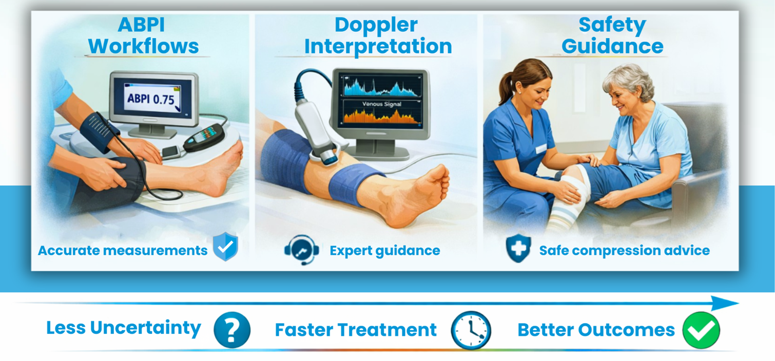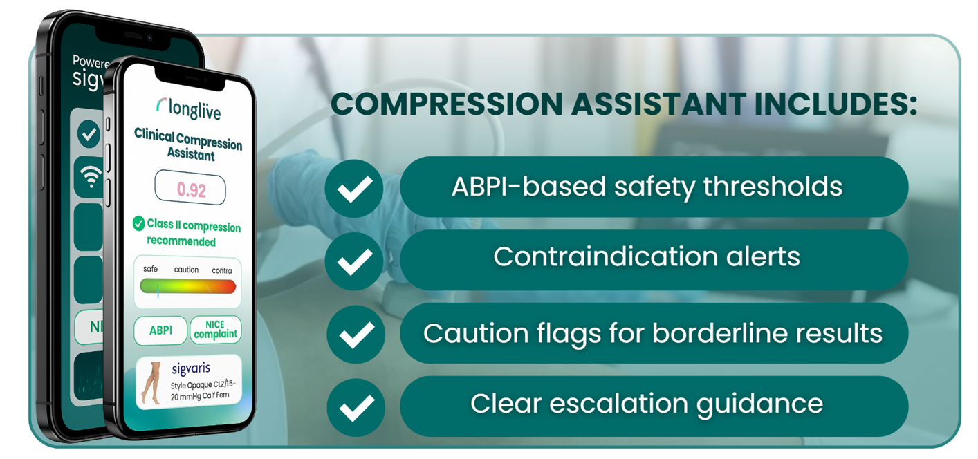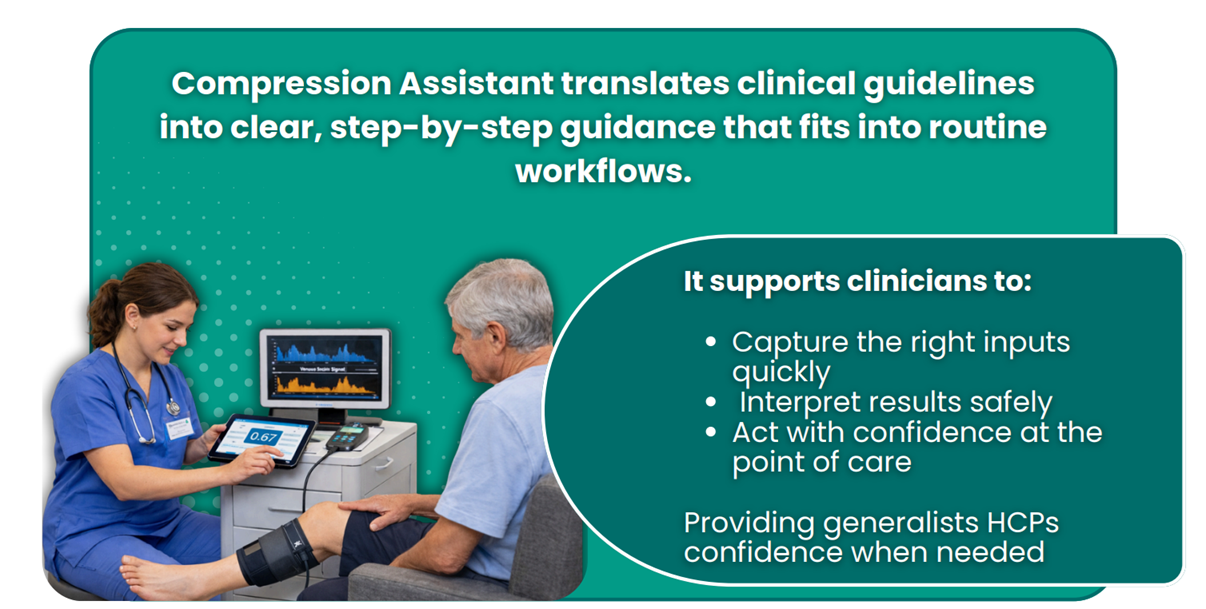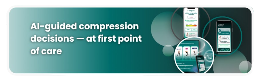 Compression Assistant is the world’s first AI-guided companion for safe, consistent compression prescribing. It supports Doppler and ABPI assessment and delivers guideline- aligned, best-practice-informed compression recommendations — from assessment to product selection — in minutes.